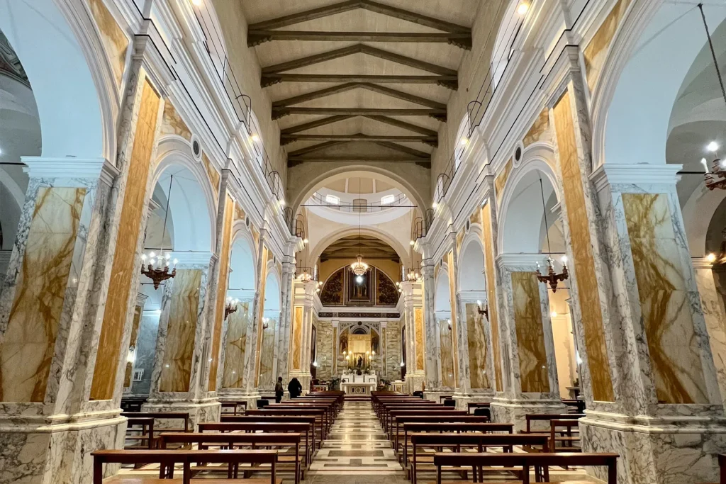 Edificata nel XVII secolo sui resti di una chiesa più antica, la basilica unisce armoniosamente elementi barocchi e neoclassici. La facciata, impreziosita dallo stemma della famiglia Migliaccio, antichi committenti dell’opera, introduce a un interno solenne a croce latina e tre navate, dominato da una grande cupola che illumina la navata centrale.