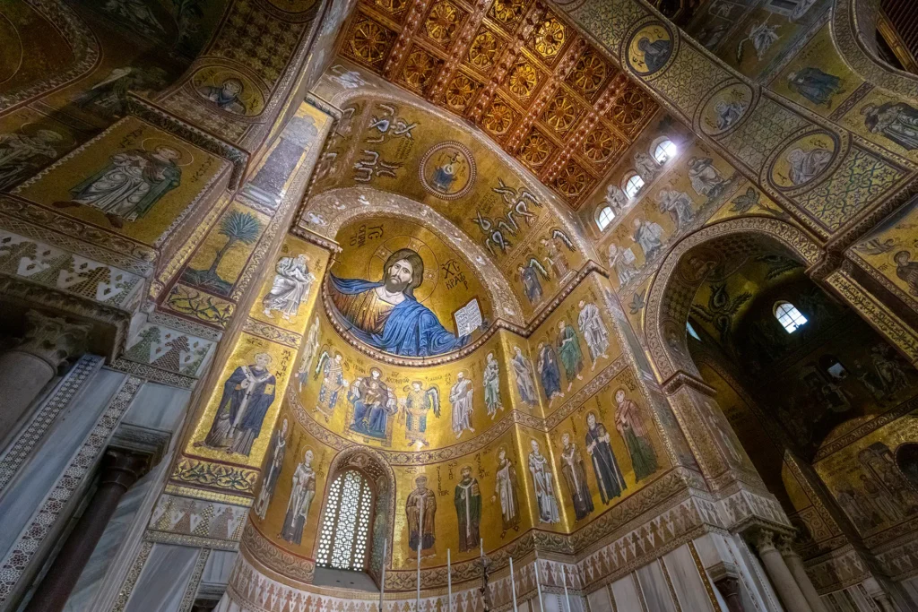 Costruito nel 1174 per volontà di Guglielmo II, l’edificio rivela al suo interno tutta la sua straordinaria sontuosità. La facciata si distingue per un portico a trifora e pregiate porte bronzee. Attraverso il portico laterale sinistro si accede al vasto interno basilicale a tre navate. L’intera chiesa è rivestita da splendidi mosaici a fondo d’oro che lasciano senza fiato. Tra questi, domina la grande figura del Cristo Pantocratore, uno dei più straordinari capolavori dell’arte musiva medievale, che con il suo sguardo solenne sembra accogliere e avvolgere ogni visitatore. La qualità dei mosaici non è uniforme: varia per finezza del disegno ed espressività, suggerendo l’intervento di artisti provenienti da diversi contesti — bizantino, locale e musulmano.