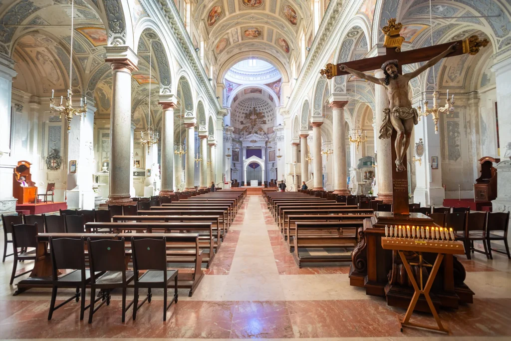 Sempre all’interno, di notevole pregio, sono gli stucchi in stile neoclassico ed i dipinti ad affresco della volta.